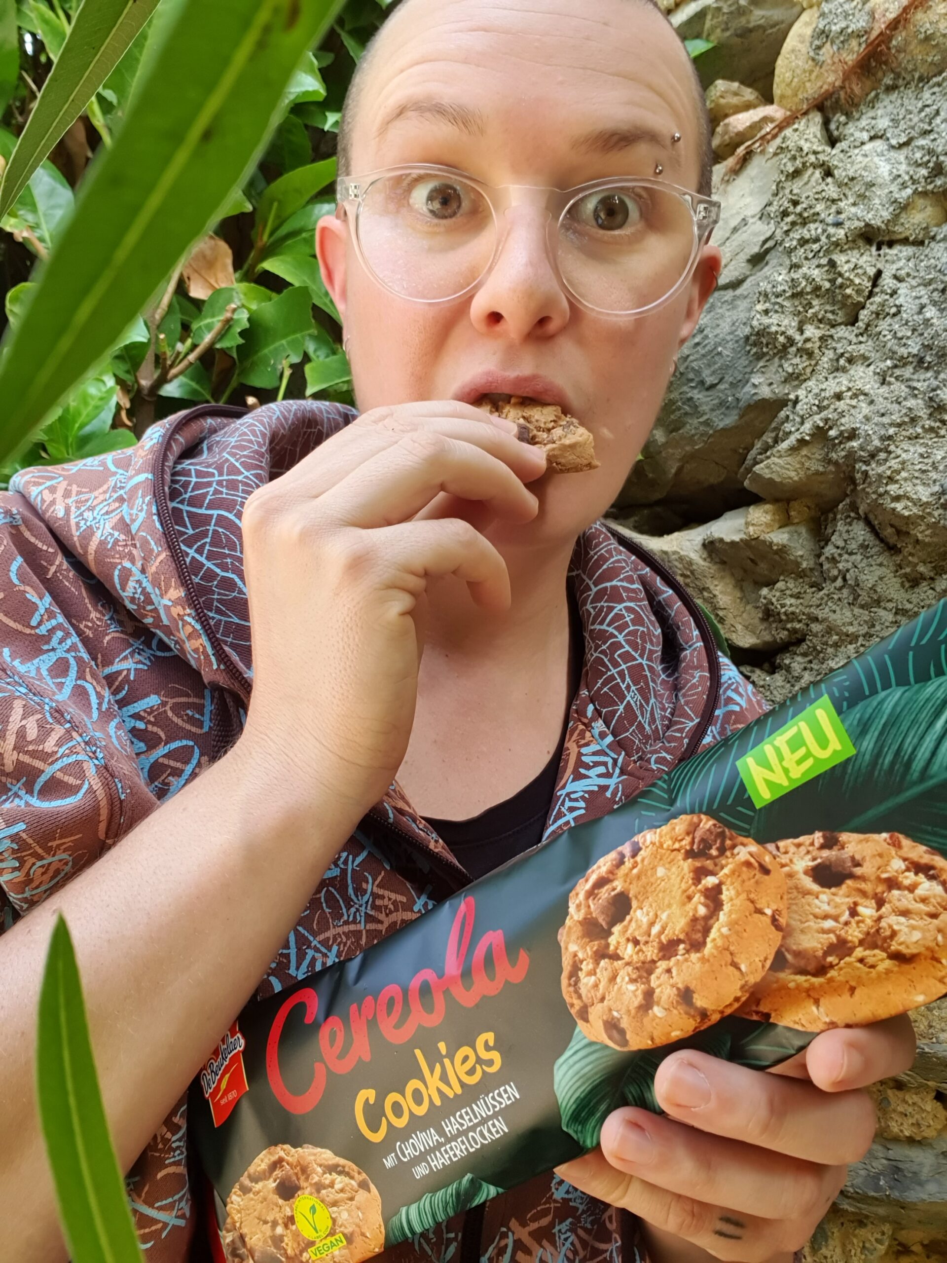 Alt text : Moi qui mange un cookie d’une main et qui tient de l’autre le sachet de cookies « Cereola ».