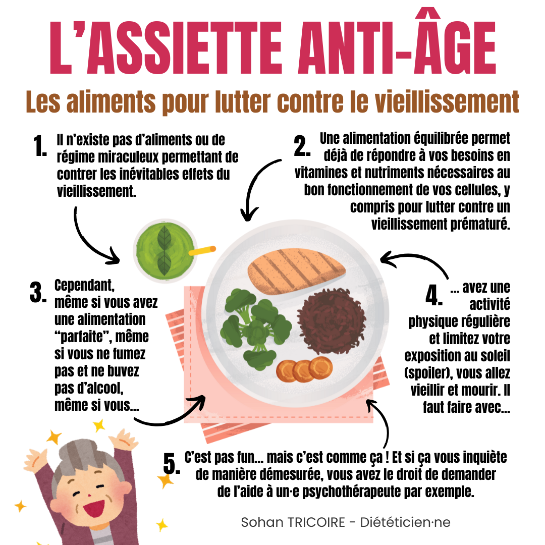 Alt text : Infographie parodique intitulée (en gros en rose et marron) « L’assiette anti-âge, les aliments pour lutter contre le vieillissement », avec en visuel une assiette remplie de nourriture avec un verre de jus vert, en dessous desquels on voit une grande-mère joyeuse, les bras en l’air. 5 flèches sont dirigées vers le repas présenté, accompagnées du texte suivant : « Il n’existe pas d’aliments ou de régime miraculeux permettant de contrer les inévitables effets du vieillissement. Une alimentation équilibrée permet déjà de répondre à vos besoins en vitamines et nutriments nécessaires au bon fonctionnement de vos cellules, y compris pour lutter contre un vieillissement prématuré. Cependant, même si vous avez une alimentation “parfaite”, même si vous ne fumez pas et ne buvez pas d’alcool, même si vous avez une activité physique régulière et limitez votre exposition au soleil (spoiler), vous allez vieillir et mourir. Il faut faire avec… C’est pas fun… mais c’est comme ça ! Et si ça vous inquiète de manière démesurée, vous avez le droit de demander de l’aide à un·e psychothérapeute par exemple. »