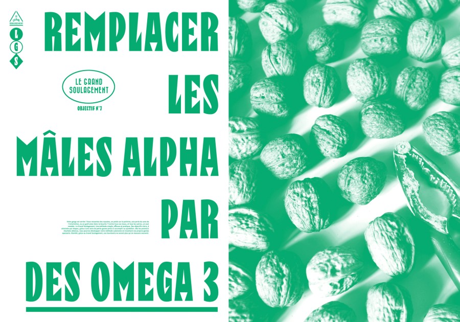 Alt text : duo d’affiches avec le texte en vert sur fond blanc. Sur la première il est écrit « Remplacer les mâles alpha par des omégas 3 » et sur la seconde on voit juste des noix de Grenobles.